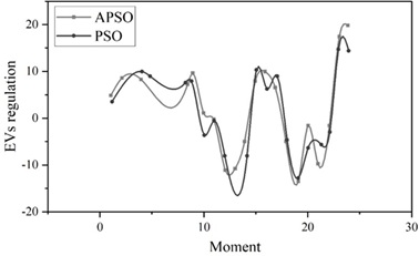 Figure 5 shows the change curve of the number of iterations of the objective function value, as can be seen from Figure 5, the objective function value decreases with the increase of the number of iterations until the maximum number of iterations can be reached to obtain the optimal solution, the improved PSO algorithm iteration speed as well as the attained fitness function value are better than before, and the iteration speed is close to 0 when the objective function value is 1809.The regulation amount of Figure 5 is counted in the grid and Figure 6 shows the EVs regulation amount, the peak regulation effect of these two algorithms is compared, the APSO algorithm is slightly higher than the PSO algorithm, and at the four peaks of 9:00, 16:00, 20:00, and 23:00, the regulation amount of the APSO algorithm is 9.638, 9.955, -1.584, and 19.819 are higher than the PSO algorithm, respectively.