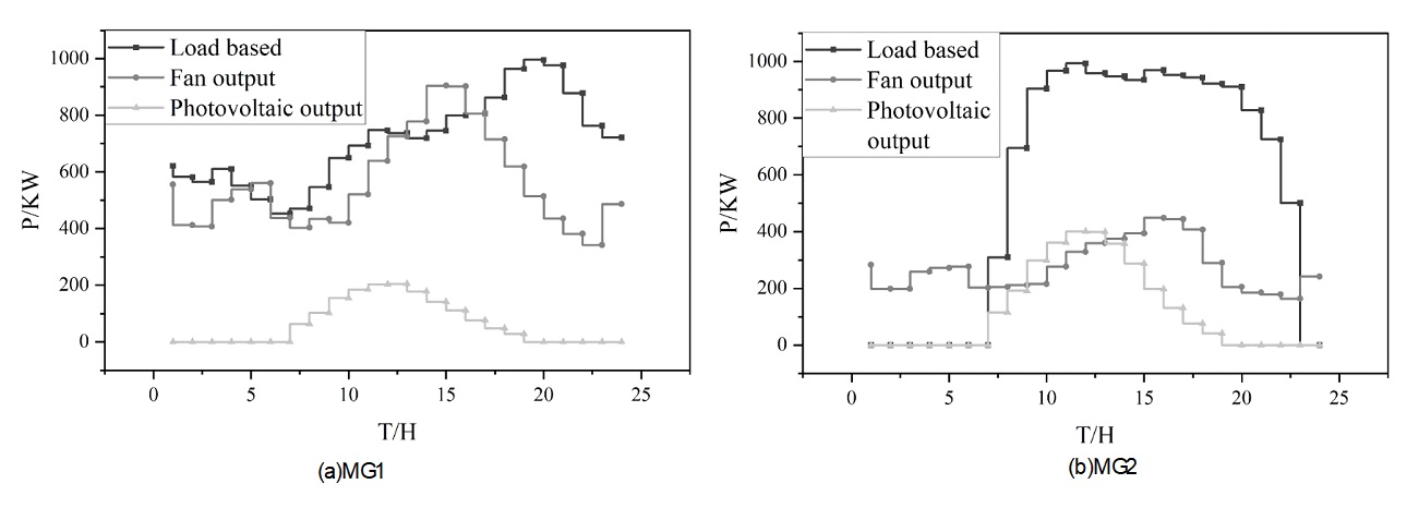 The wind turbine output, PV output, and base load of the microgrid system are shown in Figure 8, with MG1 in Fig. 8(a) and MG2 in Figure 8(b), where MG1 and MG2 denote the community and park microgrids, respectively, and the two MGs have the same ESS storage parameters, with the capacity of 1500 kW/h, the maximum charging and discharging power of 225 kW, and the maximum, minimum, and initial state of charge of 0.9, 0.3, respectively, 0.5, and the charging/discharging efficiency is 0.9. The base loads of the community and the park are different, the base load of the community is maintained at 453.05 P/KW\(\mathrm{\sim}\)995.48 P/KW all day long, and the base load of the park is 0 P/KW for two time periods, from 1:00 to 7:00 and from 20:00 to 24:00.