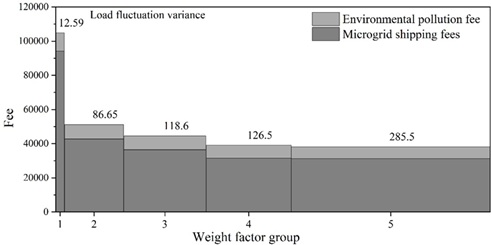 In order to analyze the influence of different weight coefficients on the optimization results, Figure 9 shows the comparison of the optimization results with different weight coefficients, comparing the optimization results under five groups of different weight coefficients, in which the values of weight coefficient 1 are taken as 0, 0.3, 0.5, 0.8, and \(\lambda _{1}\) in the groups, and the weight coefficients \(\lambda _{2}\) are taken as 1, 0.7, 0.5, 0.2, and 0, respectively. And based on the optimization results, the integrated operation and management costs and load fluctuation variance of microgrids in one dispatch cycle are counted.
