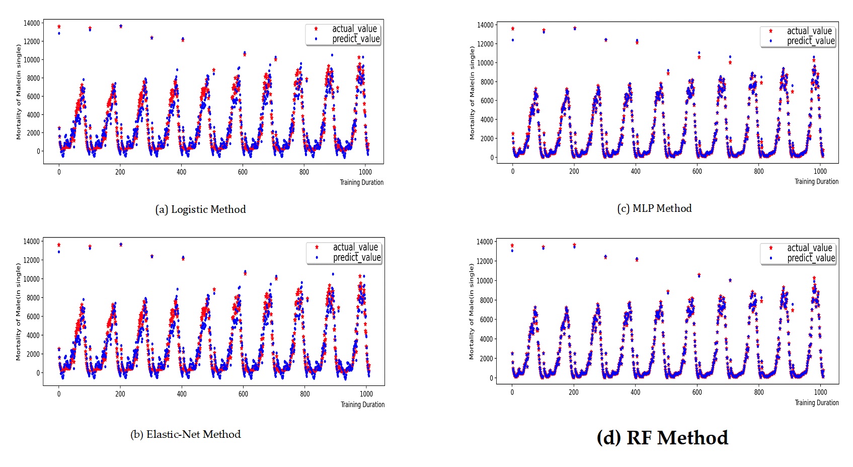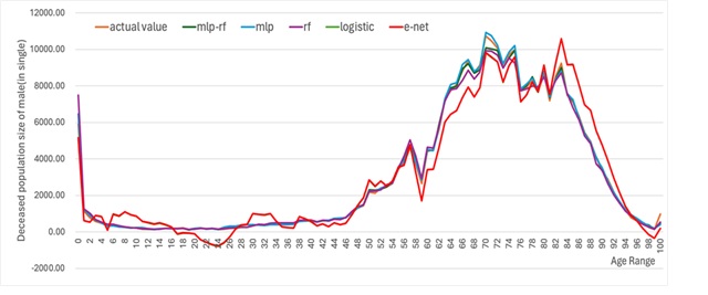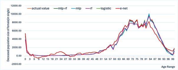 The training process and prediction results of the contrastive prediction algorithm for the death population by gender and age are depicted in Figure 9 Figure 12. Through the calculation and analysis of the error function (Table 5 to Table 6), it can be observed that the Logistic model and the Elastic-Net model exhibit a poor degree of fit. This is attributed to their utilization of linear assumptions for data identification and the presence of multi-collinearity issues in the population data, leading to a significant over-fitting phenomenon in the 0-45 age range and a larger total error of the data. The MLP model and the RF model have a better degree of fit, indicating that these two models possess a stronger ability to identify data. Nevertheless, the MLP-RF stacked model has a relatively better degree of fit and a smaller data error, suggesting that the stacked model integrates the advantages of the two machine learning models and enhances the prediction accuracy of the population data.