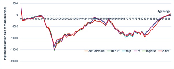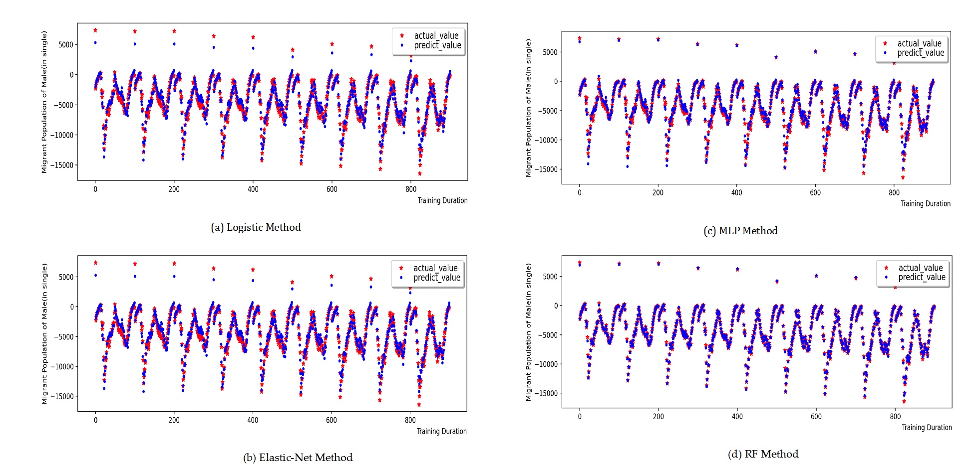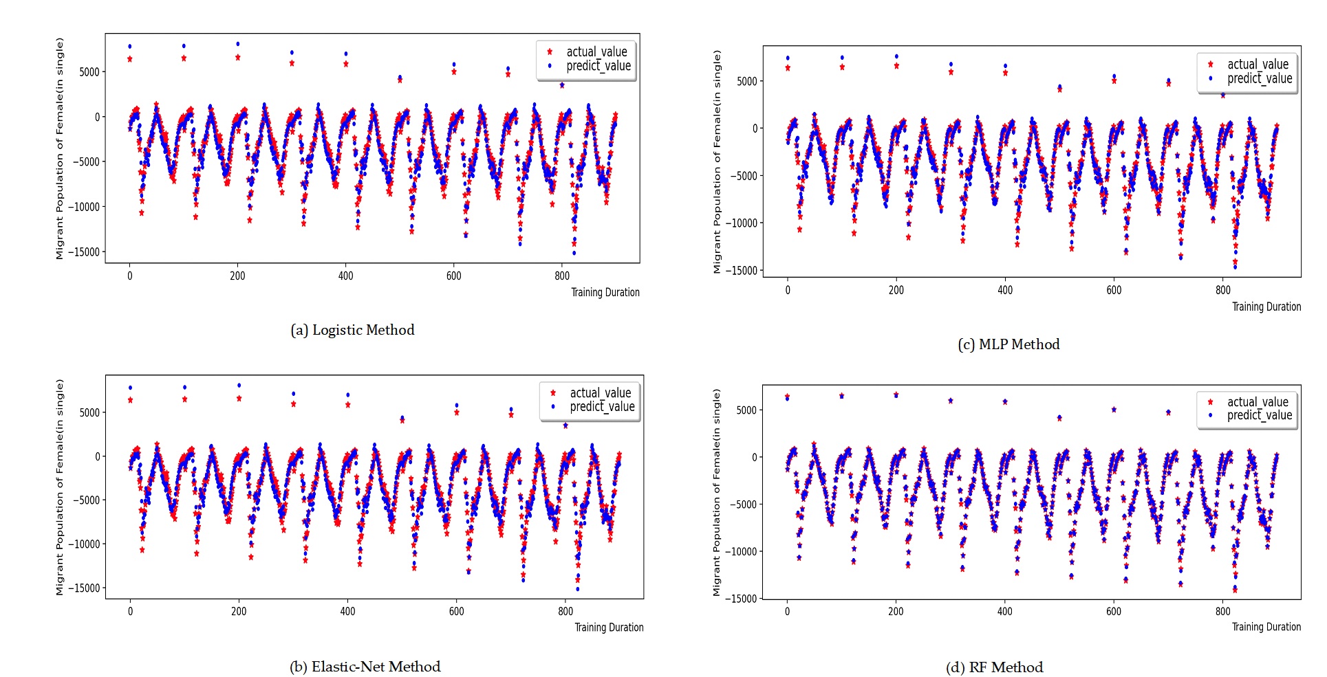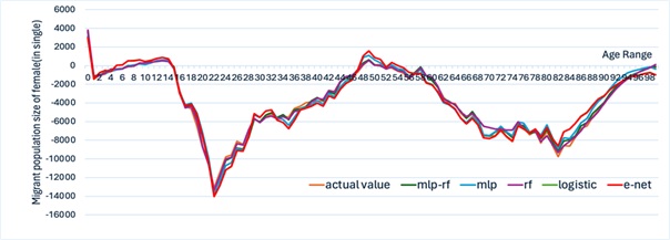 Figure 13 to Figure 16 present the training process and prediction results of each contrastive prediction algorithm for the migrant population by gender and age. In conjunction with the graph curves and the calculation and analysis of the error function (Table 5 to Table 6), it can be verified that the MLP-RF stacked model has more advantages in predicting the migrant population compared to traditional statistical models, linear regression models, and standalone machine learning models.