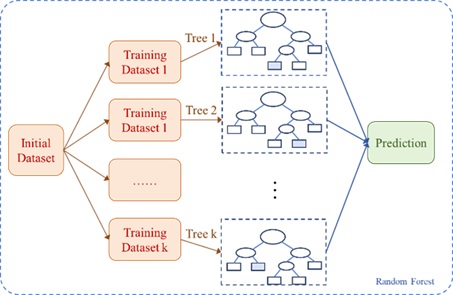 The Random Forest algorithm is an ensemble prediction technique based on decision trees. It constructs multiple decision trees for classification or regression, and makes coherent predictions for the target variable by means of voting or averaging. The working process is shown in Figure 2. Each decision tree consists of a root node with a training dataset, internal nodes where conditional states are set based on input variables, and leaf nodes that represent the actual values assigned to the target variable.