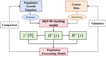 1) Using the discrete population development equation as the basic prediction model, the MLP-RF stacked model was employed to identify and predict parameters such as the natural retention rate and birth rate, which would otherwise need to be manually preset. This approach not only considers the internal statistical mechanisms of population change but also avoids prediction errors caused by preset parameters to some extent.