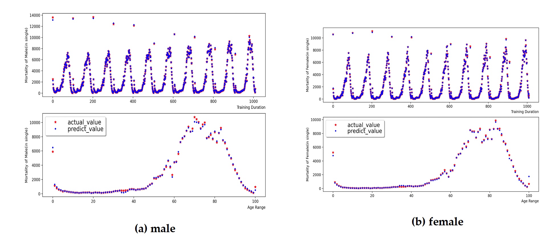When training the retention population model by gender and age group, we first perform regression training on the total population and the deceased population. The training parameters in the MLP and RF models are set respectively. The hidden_layer represents the number of hidden layers in the MLP, which is set to (400, 600) here. Max_iter refers to the maximum number of iterations, set to 2000. alpha represents the regularization strength coefficient to prevent model overfitting, set to 0.001. solver refers to the algorithm used to solve optimization problems, where the LBFGS (Limited-memory Broyden Fletcher Goldfarb Shanno) algorithm is selected. random_state is used to initialize the random number generator’s state, set to 0 here. learning_rate_init indicates the initial learning rate of the model, set to 0.01. n_estimators represents the number of trees in the Random Forest, set to 10,000. max_depth refers to the maximum depth of the trees, set to 100. n_jobs represents the number of parallel processors used, set to 6. min_samples_split is an important parameter in the Random Forest, controlling the minimum number of samples required to split a node, set to 2. min_samples_leaf controls the minimum number of samples required in a leaf node, set to 1.