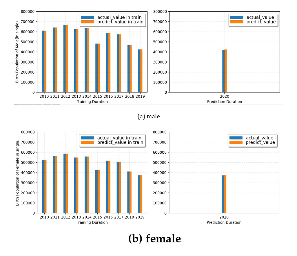 Figure 8 shows the training process and prediction results of the birth population model by gender. The predicted male birth population deviates from the actual value by 1,035, with a mean absolute percentage error (MAPE) of 0.29%. The predicted female birth population deviates from the actual value by 1,021, with a MAPE of 0.33%. Based on these results, it can be concluded that the stacked model achieves high accuracy in predicting both male and female birth populations.