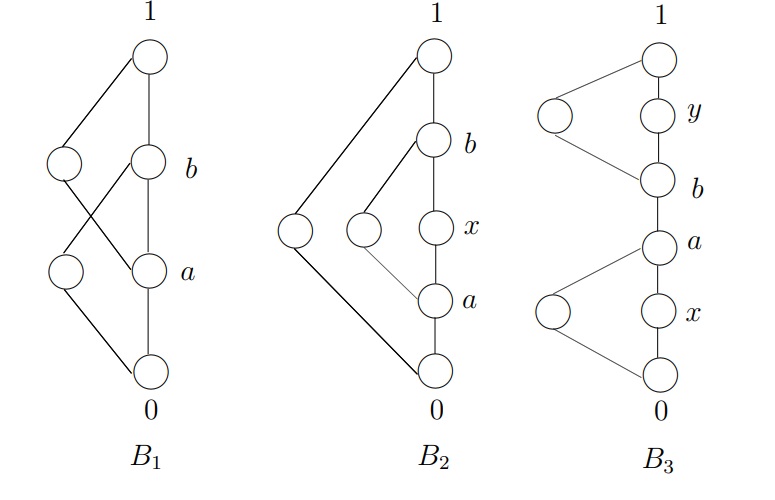 Let \(\mathscr{L}(n;r,k,h)\) be the subclass of \(\mathscr{L}(n;r,k)\) such that the basic block associated to a member of it is of height \(h\). Let \(\mathscr{B}(j;r,k)\) be the class of all non-isomorphic maximal blocks on \(j\) elements such that every member of it contains \(r\) comparable reducible elements, and has nullity \(k\). Let \(\mathscr{B}(j;r,k,h)\) be the subclass of \(\mathscr{B}(j;r,k)\) such that the basic block associated to a member of it is of height \(h\). Let \(\mathscr{L}'(n;2,k)\) be the subclass of \(\mathscr{L}(n;2,k)\) such that any \(L\in\mathscr{L}'(n;2,k)\) is of the form \(L=C\oplus \textbf{B}\oplus C'\) where \(\textbf{B}\) is the maximal block, and \(C,C'\) are chains with \(|C|\geq 1,|C'|\geq 1\). According to Bhavale [1] (Proposition 3.2.5) there are exactly three basic blocks (see Figure 1) containing four (comparable) reducible elements and having nullity two. Therefore, we have the following result.