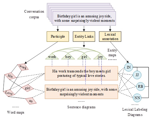 Sentence graph node. The sentence graph is represented as \(G_{s} =\left\{V_{s} ,A_{s} \right\}\), where \(s\) denotes the type of sentence graph, sentence graph node \(v_{s}^{i} \in V_{s}\) denotes the single discourse text feature vector of the speaker in a multi-round conversation \(S\) and \(A_{s}\) is the corresponding adjacency matrix of the sentence graph. The sentence graph and word-level graph is a hierarchical graph, and the network layer structure is shown in Figure 1.