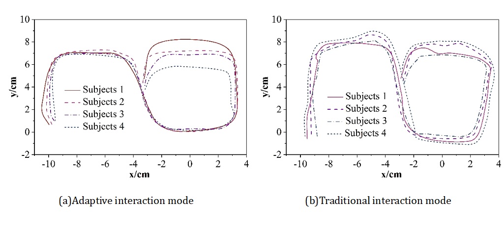 In order to verify the adaptive performance of the designed model, 4 subjects were selected from the above 60 samples, and these 4 subjects used 2 interaction modes (this paper: adaptive interaction mode, control: traditional interaction mode) to control the motion trajectory of the intelligent wheelchair at different time periods. With the extension of the subjects’ interaction time, muscle fatigue began to appear in the masticatory muscles, and the degree of muscle fatigue gradually deepened with the growth of time, the amplitude of EMG signals increased significantly, and the signal characteristics changed, which reduced the action recognition rate of the system and led to the system being uncontrolled. Figure 3 gives the movement trajectory of the wheelchair in different time periods, where (a)\(\mathrm{\sim}\)(b) are the adaptive interaction mode and traditional interaction mode, respectively. Curves 1\(\mathrm{\sim}\)4 in the figure are the training time: 1-0\(\mathrm{\sim}\)15min, 2-15\(\mathrm{\sim}\)30min, 3-30\(\mathrm{\sim}\)45min, 4-45\(\mathrm{\sim}\)60min. Table 4 then gives the four subjects in different time periods to control the intelligent wheelchair to complete the the specified route in different time periods. After the subjects continue to operate the traditional interaction mode for 45min, the smart wheelchair starts to lose control, the traditional interaction mode loses the ability to recognize muscle movements and control the wheelchair, and the time consumed to complete the specified route is obviously more than the adaptive human-computer interaction mode designed in this paper, which also verifies that the adaptive human-computer interaction mode based on the Internet of Things and deep learning has a better stability and adaptive ability.