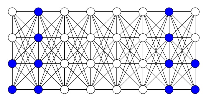 Proof. Let the vertices of \(P_m\) be \(v_1, v_2, \ldots, v_m\), and let the vertices of \(P_n \cdot v_i\) be \(u_{i,1}, u_{i, 2}, \ldots,\) \(u_{i,n}\). To show that the right hand side of our equation is a lower bound for \(\rho\), consider the following coloring of the vertices of \(P_{n} \bullet P_{m}\): (1) all of the vertices of \(P_n \cdot v_3, P_n \cdot v_4, \ldots, P_n \cdot v_{m-2}\) receive different colors, (2) the vertices \(u_{1,1}, u_{1, 2}, u_{1,n-2}\), and \(u_{n, 1}, u_{n, 2}, u_{n, n-2}\) each receive an additional unique color, and (3) the remaining vertices all receive the same color (shown in blue in Figure 2). It is easy to see that such a coloring does not admit a polychromatic dominating set. It is a straightforward case analysis to show that the right hand side of our equation is also an upper bound and thus equality is achieved. ◻