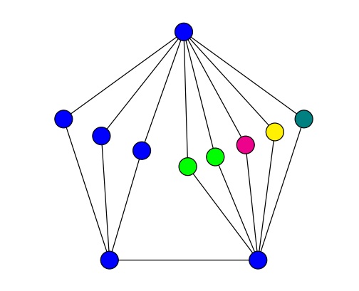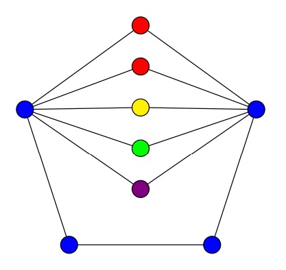 Figure 3 A 5–coloring of \(C_5\) with four degree-2 vertex duplications on a single vertex and no polychromatic dominating set