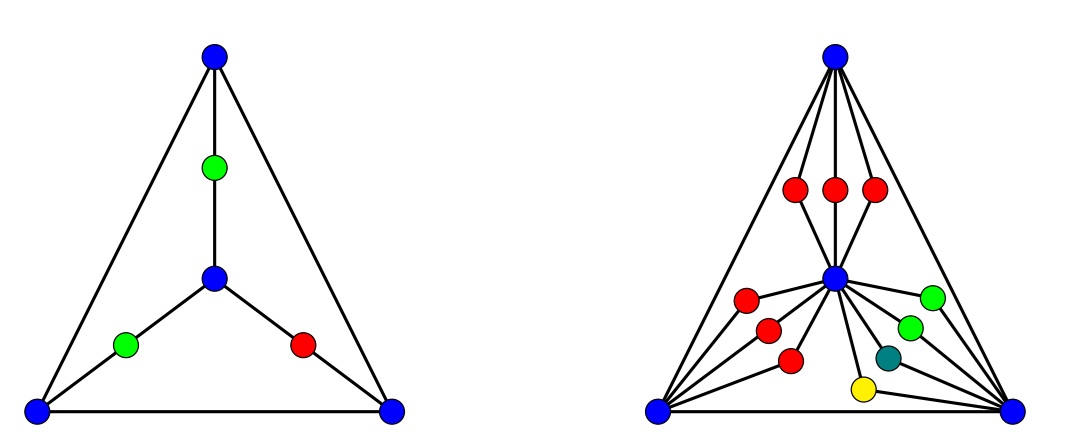 Figure 5 \(G_7\) and again after \(k_1+k_2+k_3=7\) degree-2 vertex duplications; colorings with no polychromatic dominating sets are shown