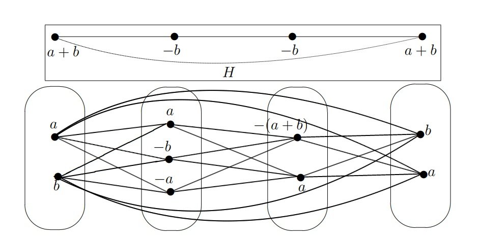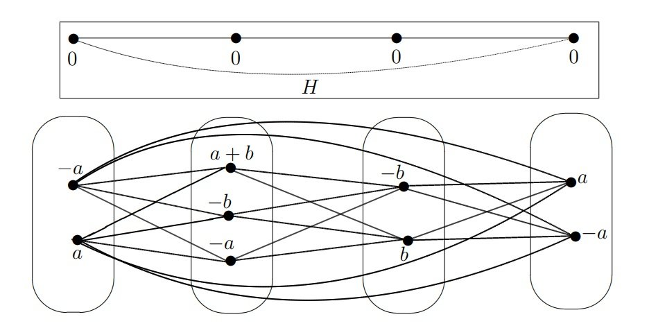 Example 3.8. For the graph \(G\) given in Figure 2, the reduced graph \(H\) is \(C_4\). Let \(A\) be any Abelian group with \(|A| \geq 3\). Figure 3 gives an \(A'\)-vertex magic labeling of \(C_4\) with magic constant \(0\). Figure 4 gives an \(A'\)-vertex magic labeling of \(C_4\) with magic constant \(a\) for any \(a \in A \setminus \{0\}\). Hence by Proposition 3.7, \(gdms(G) = rgdms(G) =A\).