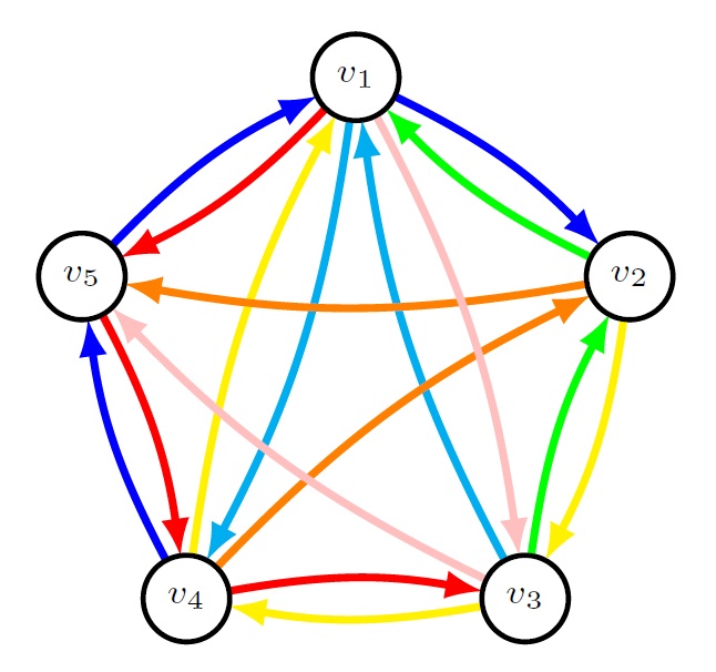 Within the research area of task design, mathematics education researchers differentiate between types of practice. Blocked practice refers to a set of tasks that assesses one particular skill, whereas mixed practice refers to a set of tasks that assesses many different skills [9]. However, these two categories of practice are not mutually exclusive and depend on the definition of the skill being assessed. For example, when Calculus students first learn how to take derivatives, they learn some facts like the derivatives of the six trigonometric functions. These facts could constitute blocked or mixed practice depending on how one defines a skill. If we want to assess the skill of “Taking derivatives of trigonometric functions”, then recalling these facts is blocked practice. However, if we consider each fact as a skill, then recalling these facts is mixed practice. In this paper, we will consider decompositions of a vertex labeled complete directed graph because we aim to construct different types of mixed practice where the skills are the set of vertex labels. Using this approach, every possible ordered pair of skills occurs exactly once in a task set.