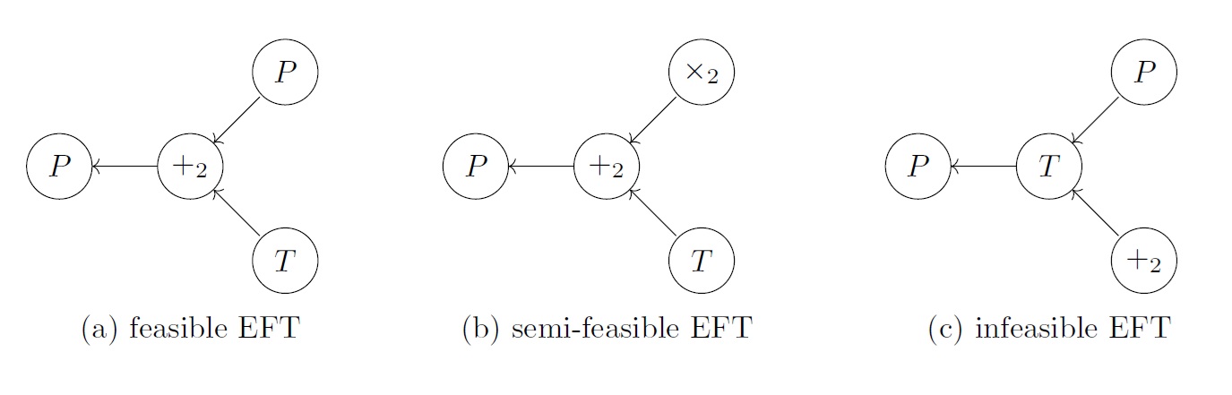 1. A feasible EFT is an EFT that has at least one corresponding elementary function. In other words, if \(v\in V\) with \(\Lambda(v)\in\mathcal{F}\), then deg\(^-(v)\leq1\) and deg\(^+(v)\leq1\), and if \(v\in V\) with \(\Lambda(v)\in\mathcal{O}\), then deg\(^-(v)=i\) and deg\(^+(v)\leq1\).