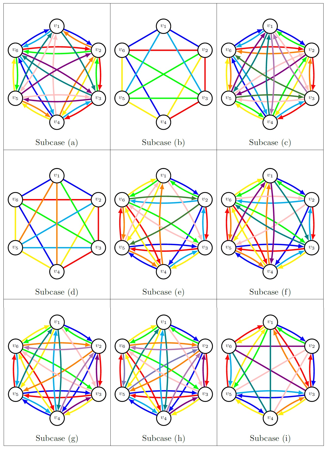 Proof. Let \(V(\mathcal{D}K_5)=\{v_1,…, v_5\}\). We proceed by construction via case analysis. Since \(5\ |\ x_1+x_2+x_3\) and \(x_1+x_2+x_3\leq 20\), we only have to verify solutions of \(x_1+x_2+x_3=s\) for \(s\in\{10,15\}\). The case \(s=20\) is already established by Lemma 6.1. Within each case, we denote each subcase by the ordered triple \((x_1,x_2,x_3)\) of the corresponding solution to \(x_1+x_2+x_3=s\), for \(s\in\{10,15\}\). For each subcase, we construct the BNHDPD\((5,k)\) \[\bigcup_{i=1}^{n-2} (P_i\cup P'_i),\] where \(P_i, 1\leq i\leq n-2\), is the set of directed paths of length \(i\), and \(P'_i, 1\leq i\leq n-2\), is the set of some, but not necessarily all, reverses of \(P_i\). Visualizations of each construction are given in Figures 5 and 6.
