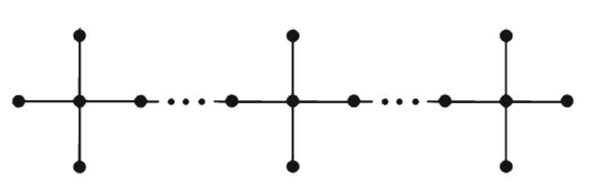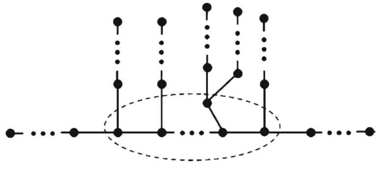 Chemical trees \(\pmb{\mathscr{T}}^{(1)}_{n,p}\) (\(n\geq7\), \(3\leq p\leq \lfloor\frac{n+2}{3}\rfloor\)) and \(\pmb{\mathscr{T}}^{(2)}_{n,p}\) (\(n\geq9\), \(6\leq p\leq \lfloor\frac{n+3}{2}\rfloor\) is even) are depicted in Figure 1 and Figure 2, respectively. The chemical trees \(\pmb{\mathscr{T}}^{(1)}_{n,p}\) contain \(p-2\) vertices with maximum degree 3, which induce a tree and everyone of these vertices is adjacent to either a 2-degree vertex or another 3-degree vertex. The chemical trees \(\pmb{\mathscr{T}}^{(2)}_{n,p}\) are composed of \(\frac{p}{2}-1\) stars \(S_{5}\) which are joined together by paths whose lengths may be 0.