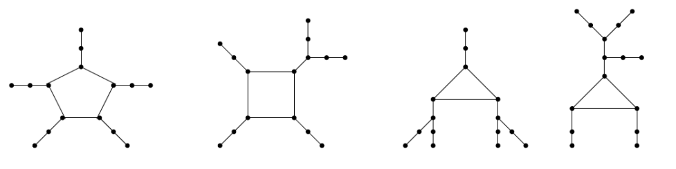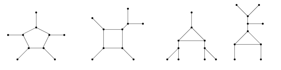 Let \( {\mathbb{G}}_{n,m,p}\) be a collection of \((n,m,p)\)-graphs arising from \((n',m',p,3)\)-semi-regular graphs by adding several new vertices on each pendent edge. Since \(p+n_{2}+n_{3}=n\) and \(p+2n_{2}+3n_{3}=2m\) for \( {\mathbb{G}}_{n,m,p}\), it shows that \(n_{2}=3n-2m-2p\) and the number of new vertices added is \(3n-2m-2p\). One can easily see that \( {\mathbb{G}}_{n,m,p}\subseteq {G}_{n,m,p}\) (resp. \( {MG}_{n,m,p}\)). For instance, in Figure 3 and Figure 4, four \((10, 10, 5, 3)\)-semi-regular graphs and (15,15,5)-graphs in \( {\mathbb{G}}_{15,15,5}\) are depicted, respectively.