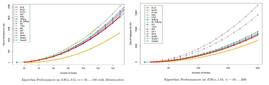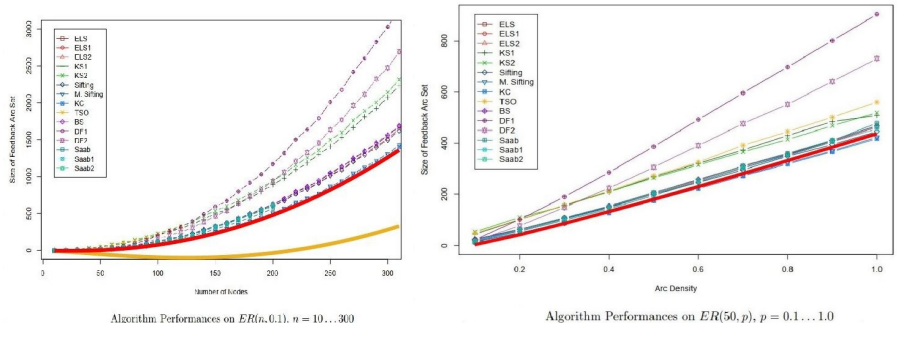 In Figure 2 the left figure involves \(p=.1\) and so reflects relatively low density. In the final figure (lower right), we see feedback arc sets for different values of \(p\) when applied to a fixed number \(n=50\) of vertices. Here we only plot our heuristic approximation.