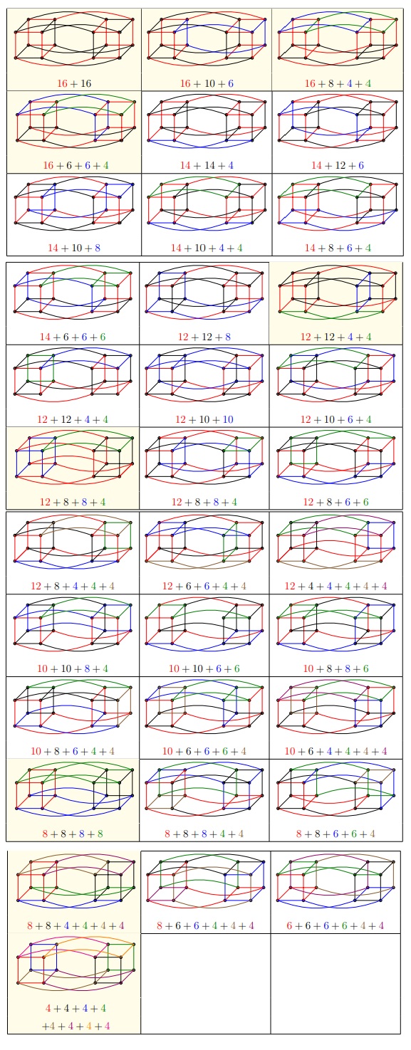 Note that \(|V(Q_4)|=2^4=16\) and \(|E(Q_4)|=32.\) We look at the problem of finding cycle decompositions of \(Q_4\) in view of partitioning the number \(32\) as \(k_1+k_2+\ldots+k_r,\) where \(k_i\)’s are all even and \(4\leq k_i \leq 16,~ i=1,2,\ldots,r.\) Following is the list of such partitions.
