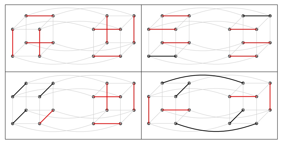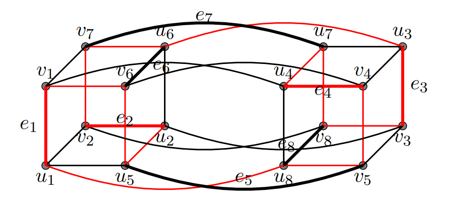 Illustration. Consider a hamiltonian decomposition of \(Q_4\) into cycles \(C_1\) (red colour) and \(C_2\) (black colour) along with a perfect matching containing \(4\) edges each from both the cycles (shown by bold edges in Figure 5). Let the edges from cycle \(C_1\) contributing to the perfect matching be \(\{e_1=(u_1,v_1),e_2=(u_2,v_2),e_3=(u_3,v_3),e_4=(u_4,v_4)\}\) and those from \(C_2\) be \(\{e_5=(u_5,v_5),e_6=(u_6,v_6),e_7=(u_7,v_7),e_8=(u_8,v_8)\}.\)
