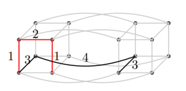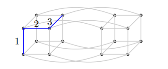 e.g.- (1) Consider paths \(P(\textit{0},S)\) and \(Q(\textit{0},S'),\) where \(S=(1,2,1)\) and \(S'=(3,4,3)\) in \(Q_4.\) Then there exists a permutation \(\theta=(1,3)(2,4),\) such that \(\theta(P)=Q.\) Therefore paths \(P\) and \(Q\) are of the same type.