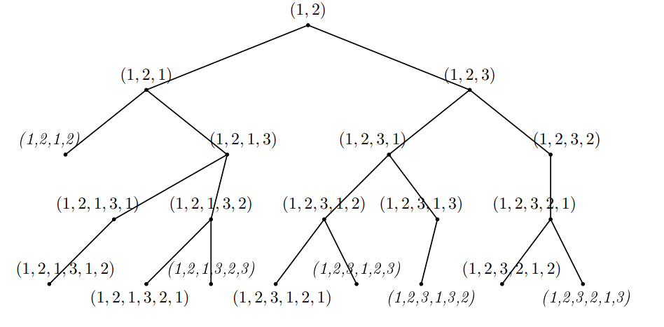 We give an illustration of the algorithm in Figure 4 for paths up to length \(6\) in \(Q_3.\) We have represented the algorithm as a rooted tree, with root \((1,2),\), i.e., our initial path in the algorithm. The paths of length \(3\) constructed from \((1,2)\) are shown by the branches of the root, and we continue so on till we get paths of length \(6.\) The paths shown in bold type are cycles.