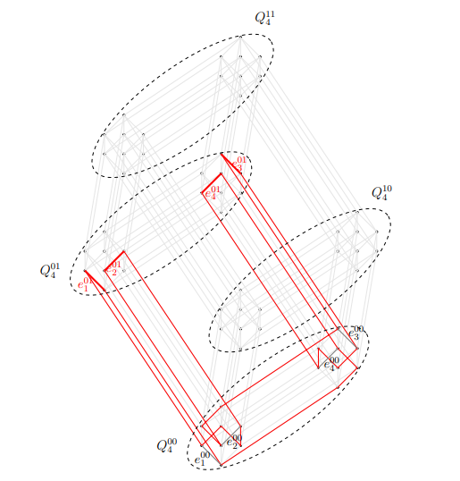Let \(C_1^{ij}\) and \(C_2^{ij}\) be the \(16\)-cycles in \(Q_4^{ij}\) and let \(u_k^{ij},v_k^{ij}\) be the end vertices of the edges \(e_k^{ij}\) in the perfect matching of \(Q_4^{ij},\) \(i,j\in\{0,1\},\) \(k\in\{1,2,\ldots,8\}.\)
