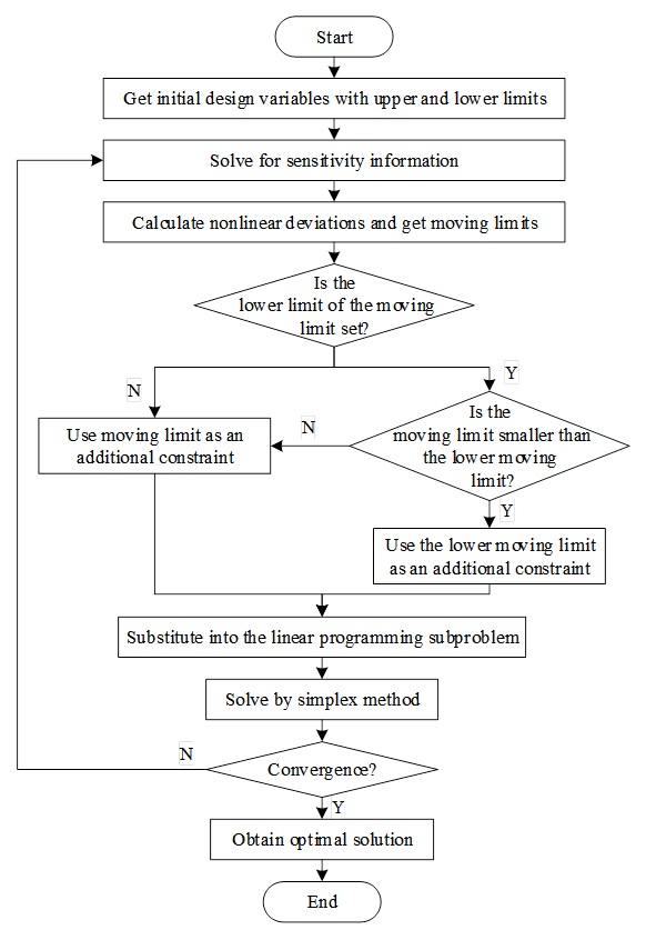 The workflow of the sequential linear programming procedure for the structural optimization model is illustrated in Figure 1.