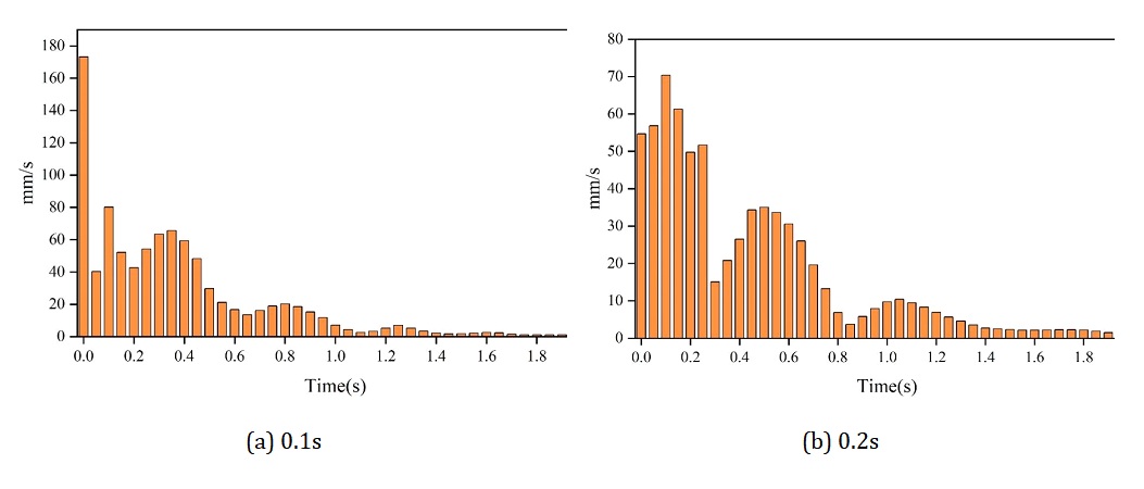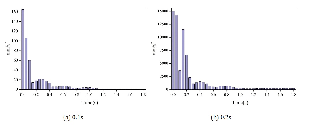 The velocity response of the main beam structure is shown in Figure 9. The acceleration response of the main beam structure is shown in Figure 10. From the velocity and acceleration graphs, it can be seen that the shorter the time given to the wire rope tightening phase, the greater the amplitude of the velocity and acceleration, which will cause a greater impact on the main beam, so when setting the time for the crane to lift the goods, it should be as long as possible to make the time away from the ground, so that the goods can be lifted smoothly.