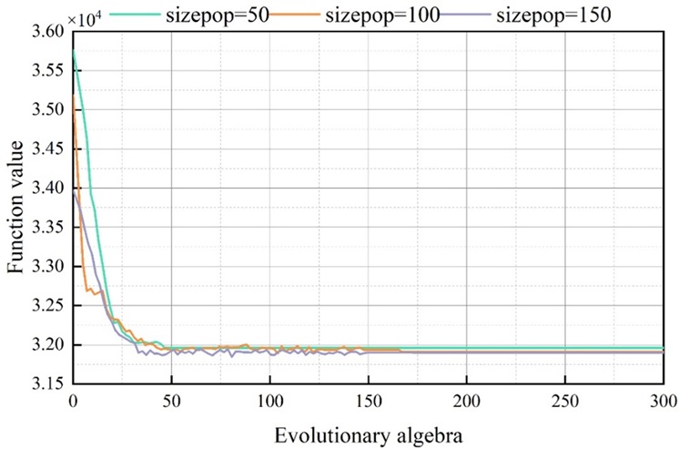 The size of the population size is selected according to the difficulty of solving the problem, such as the number of peaks of the solution function and the number of constraints. In general, the larger the population size, the better the population diversity, the stronger the global search ability, and at the same time, its search accuracy will be correspondingly improved, and the faster the convergence speed will be, but the larger the population size, the larger the computational volume, and the longer the time of its solving computation will be. All other parameters in the algorithm are set the same, and the population size of 50, 100, 150 were selected for calculation and testing for 30 times. The relevant data obtained during the calculation process are shown in Table 3, and in order to visualize the performance of the algorithm parameters, the floating-point type data comparison is used directly. The curve graph of the results of one test is randomly selected for comparison, and its optimal individual fitness change curve is shown in Figure 4. Combined with Table 3 and Figure 4 for analysis, in the case of other settings of the algorithm are the same, it is found that when the population size is 50, its iterative computation converges prematurely, and it is easy to fall into the local optimum, and the global search ability is poor. Under a limited number of iterations, its converged optimal solution is worse than the solutions obtained when the population size is 100 and 150. The optimal fitness change curves are similar when the population size is 100 and 150 respectively, and the solutions obtained at the end are basically the same, and the values of their design variables are basically the same after rounding. In addition, the average number of optimal solution generations for population size 100 is 166, and the average number of optimal solution generations for population size 150 is 177, compared to which the algorithm for population size 100 has a faster convergence speed on average, and the amount of computation is relatively small. Through the above comparisons, the population size sizepop=100 is selected after comprehensively considering the factors such as the advantages and disadvantages of the solutions, the convergence speed, and the size of the computation.