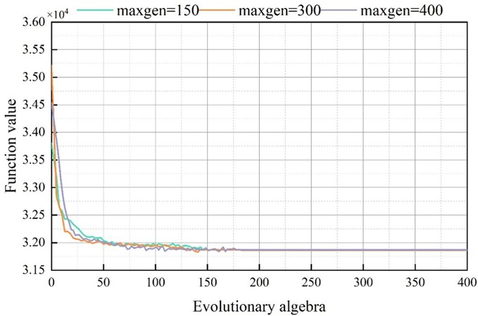 In the process of optimization calculation, the solution result will gradually converge with the increase of iteration number, and finally satisfy the termination condition, so the choice of the maximum number of times directly determines the advantages and disadvantages of the optimization result. If the number of iterations is too small, the early termination of the calculation may occur, and the number of iterations is too large, which may cause a waste of computing resources. Therefore, in this paper, in the case of population size of 100, the maximum number of iterations are selected as 150, 300 and 400 for the test, and the data obtained are analyzed by statistical comparison. Each case is tested 30 times, and the statistical comparison data are shown in Table 4, and the change curve of the optimal individual fitness at different maximum iteration times is shown in Figure 5. Combined with Figure 5 and Table 4, it can be analyzed that, when the population size is 100, and under the premise of other parameter settings are also the same, it can be obtained from Figure 5 that, when the maximum number of iterations is 150, the evolutionary iteration stops at the 144th generation, and the obtained optimal solution is poorer than that obtained at the maximum number of iterations of 300 and 400, respectively, the iteration is terminated too early, and the iterative computation has not yet converged to the optimal solution. As can be seen from Table 4, the two cases when the number of iterations is 300 and 400 respectively, the objective function values obtained from the optimization are very close, and the average number of optimal solution generations of the former appeared around the 176th generation, compared with the latter, convergence is good, and the amount of computation is also relatively small. The maximum number of iterations maxgen=300 is selected after considering the quality of the solution, the convergence of the algorithm and the amount of computation.