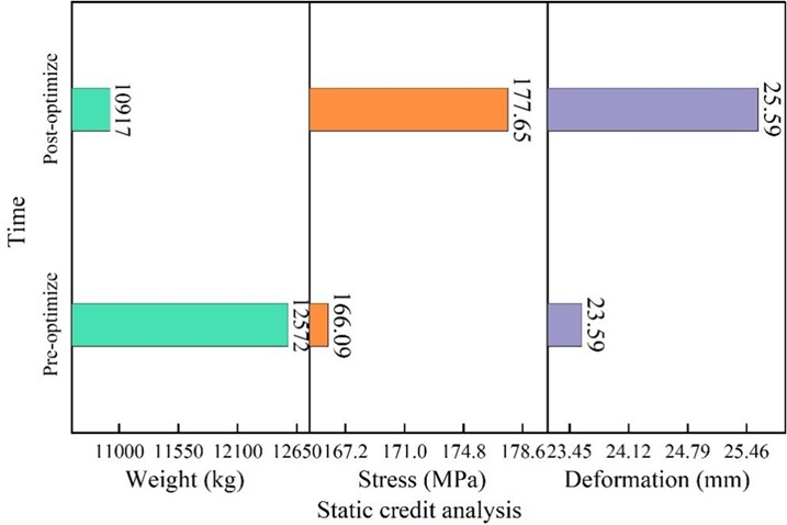 In order to deeply investigate whether the optimized main girder structure meets the strength and stiffness requirements of the crane, the optimized main girder structure model is subjected to static analysis. The comparison of the static analysis results before and after optimization is shown in Figure 6. The mass of the main girder before and after optimization is 12,572kg and 10,917kg respectively, which is reduced by 1,655kg, with an optimization rate of 13%, and the quality target optimization effect is remarkable. According to the “Crane Design Code” (GB/T 3811-2008) about the maximum static deflection of the main girder of the bridge crane \(\mathrm{\le}\) S/1000, the permissible static deflection should be less than 32mm, and the permissible stress should be less than 181Mpa.The maximum stress of the optimized main girder structure is 177.65Mpa, and the maximum deflection deformation of the span is 25.595mm, and the strength, stiffness calibration is passed. The optimized main girder structure meets the design requirements. Therefore, the main girder structure of the crane has better static characteristics and deformation resistance after optimization.