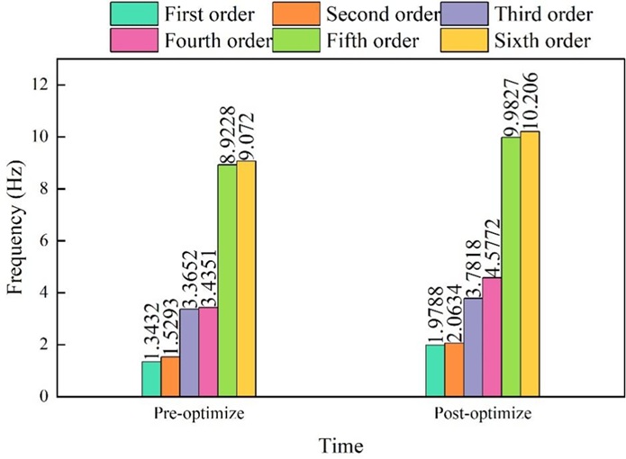 Before and after the optimization of the main girder structure of each order frequency comparison shown in Figure 7. Before optimization, the inherent frequency of the vertical direction of the bridge is 3.3652Hz, and after optimization, the inherent frequency of the vertical direction of the bridge is increased to 3.7818Hz, with an optimization rate of 12.38%. The dynamic performance target optimization effect is remarkable.