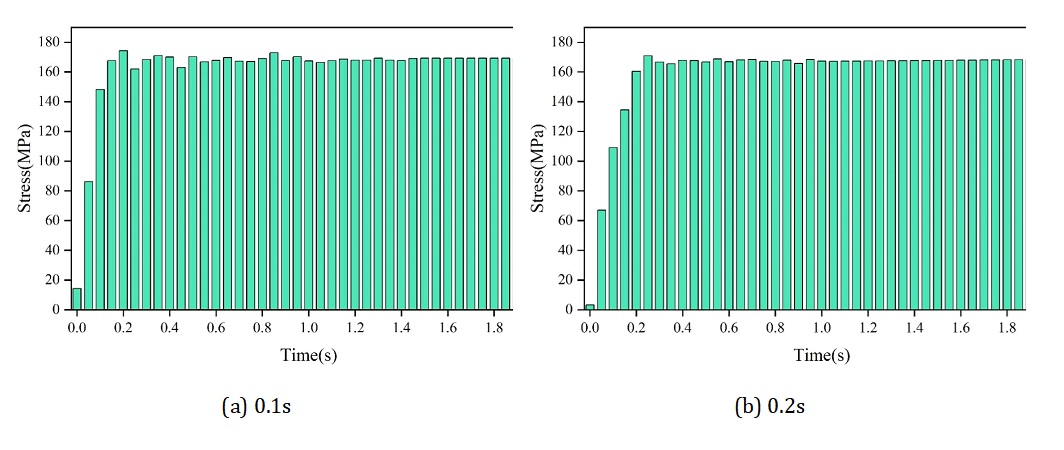 3) The goods leave the ground, at this time the goods are lifted more smoothly, the force of the wire rope remains constant, equal to the gravity of the lifted items. In the first stage of the crane trolley for goods lifting, the wire rope is not stressed, the main analysis is the wire rope starts to tension until the goods leave the ground smoothly stage, to verify the safety performance of the main beam under the changing load. For the selection of the main beam time step, divided into two stages, the first stage is from the wire rope pulling up to the tensioning stage, the second stage is the rapid rise of the goods stage, for the first stage of the faster time, respectively, take 0.1s and 0.2s as the end time, after a number of tests, the end of the second stage of the time is set at 2 s. The damping ratio of the metal structure of the crane is generally 0.008-0.05. The stress response of the main beam structure is 0.008-0.05. The main analysis is that the wire rope is not under tension until the goods leave the ground smoothly.