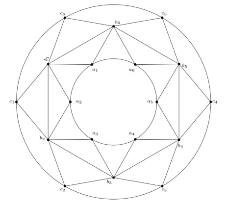 A convex polytope denoted by \(U_{\nu}\) has \(3\)-sided, \(4\)-sided and \(5\)-sided faces. Vertices of \(U_{\nu}\) for \(\nu\geq 3\), are divided into four sets, \(A = \{a_\psi: 1\leq \psi\leq \nu\}\), \(B = \{b_\psi: 1\leq \psi\leq \nu\}\), \(C = \{c_\psi: 1\leq \psi\leq \nu\}\) and \(D = \{d_\psi: 1\leq \psi\leq \nu\}\). The cycles formed by \(\{a_\psi: 1\leq \psi\leq \nu\}\), \(\{b_\psi: 1\leq \psi\leq \nu\}\) and \(\{d_\psi: 1\leq \psi\leq \nu\}\) are called interior cycle, center cycle, and exterior cycle, respectively. The set of vertices \(\{c_\psi: 1\leq \psi\leq \nu\}\) is called the set of interior vertices. The set \(V (U_{\nu}) = A\cup B\cup C\cup D\) and \(E(U{\nu})= \{a_\psi a_{\psi+1}: 1 \leq \psi\leq \nu-1\}\cup\{a_1 a_{\nu}\}\cup\{a_\psi b_{\psi}:1 \leq \psi\leq \nu\}\cup\{b_\psi b_{\psi+1}: 1 \leq \psi\leq \nu-1\}\cup\{b_1 b_{\nu}\}\cup \{b_{\psi}c_{\psi}: 1 \leq \psi\leq \nu\}\cup \{c_\psi d_{\psi}: 1 \leq \psi\leq \nu\}\cup \{c_{\psi+1}d_\psi: 1 \leq \psi\leq \nu-1\}\cup \{c_1d_{\nu}\}\cup\{d_\psi d_{\psi+1}: 1 \leq \psi\leq \nu-1\}\cup\{d_1 d_{\nu}\}\) are vertex set and edge set of convex polytope \(U_{\nu}\) respectively. The graph \(U_{6}\) is shown in Figure 3.