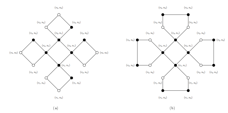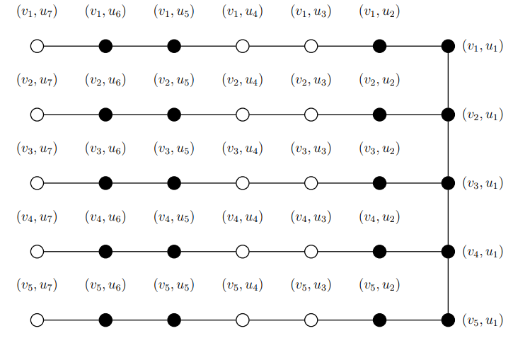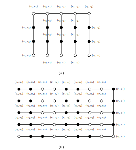 Here, to get the desired result, we choose a paired dominating set \(S\) similar to the one considered for \(m\equiv 2\pmod{4}\) as the \(PDI\)-set. That is, \(\{(v_i,u_1)|1\leq i\leq n\}\in S\) and then we choose \((\frac{m-1}{4})\) pairs of vertices from each of the \(n\) copies of \(C_m\) such that the induced subgraph of \((C_n\rhd C_m)-S\) contains \(P_2\)’s and isolated vertices. Consequently, we get \(PDI(C_n\rhd C_m)=min\{|S|+m((C_n-C_m)-S)\}=n+n(2(\frac{m-1}{4}))+2=\frac{nm+n+4}{2}\). However, we note that for \(m=5\), \(m((C_n\rhd C_m)-S)=1\) (see Figure 7(b)) and hence \(PDI(C_n\rhd C_5)=n+n(2(\frac{m-1}{4}))+1=\frac{nm+n+2}{2}\).