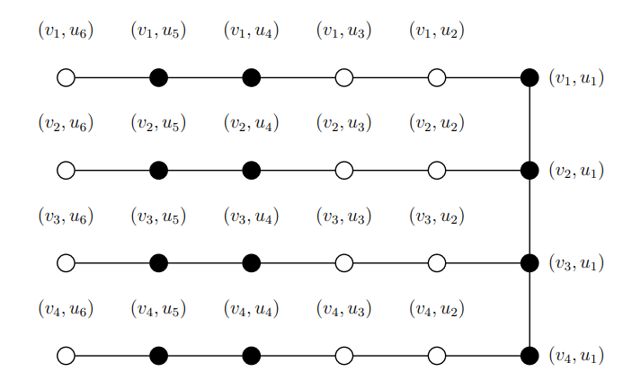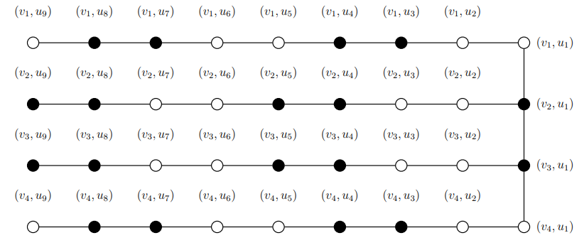 If we go through all possible paired dominating sets in this case, then we reach the paired dominating set \(S\) that gives the minimum value for \(|S|=m((P_n\rhd P_m)-S)\), the explanation of which is discussed as follows. We begin by considering all the vertices of \(P_n\) to belong to \(S\). Next, we choose \((\frac{m-2}{4})\) pairs of vertices from each of the \(n\) copies of \(P_m\) such that we leave two vertices between every chosen pair which leads to \(m((P_n\rhd P_m)-S)=2\) (see Figure 5). The cardinality of \(S\) is \(|S|=n+n(2(\frac{m-2}{4}))=\frac{nm}{2}\) and thus \(PDI(P_n\rhd P_m)=min\{|S|+m((P_n\rhd P_m)-S)\}=\frac{nm}{2}+2\).