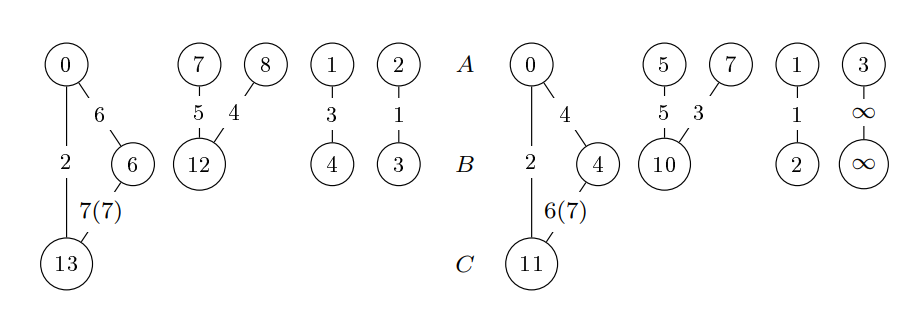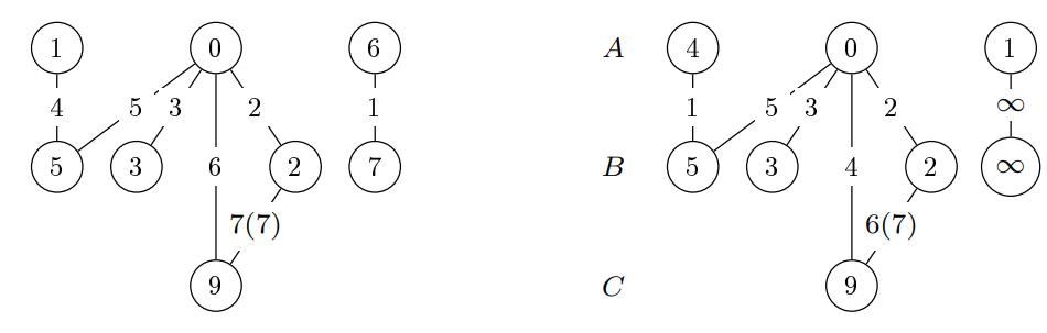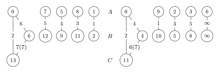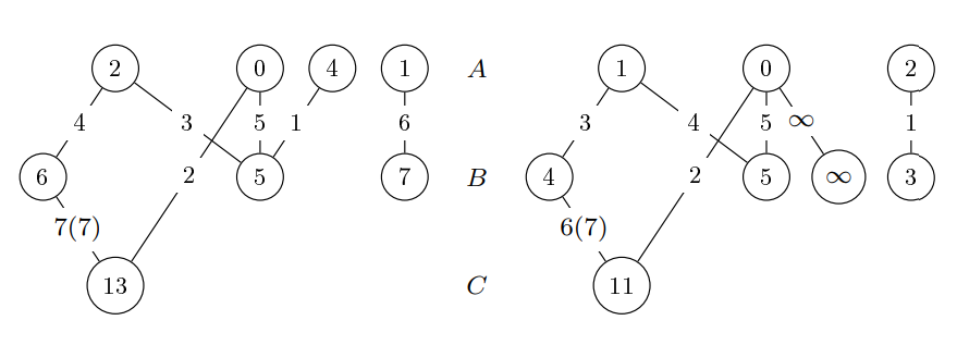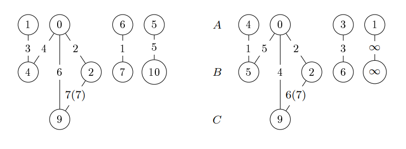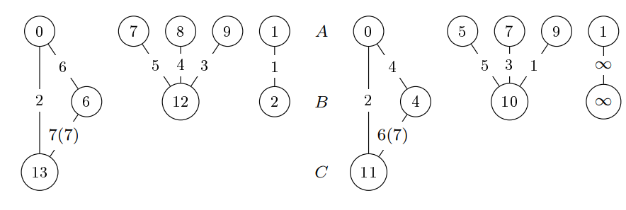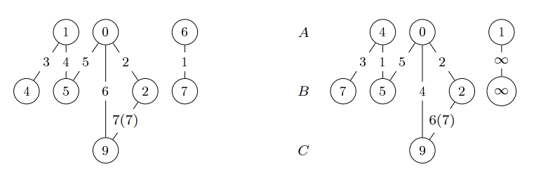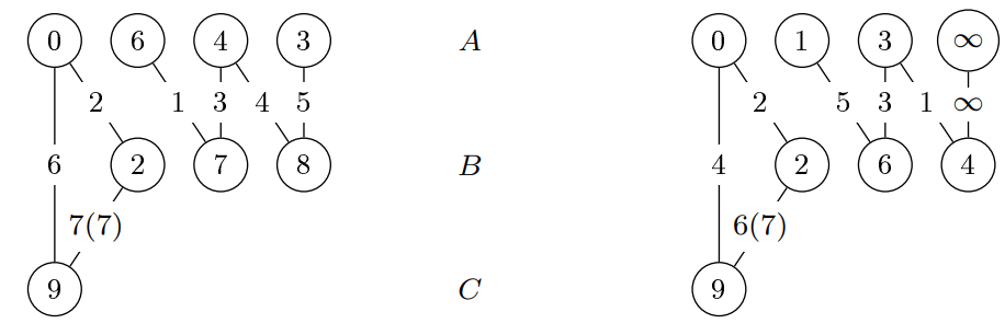 Below we present \(\rho\)-tripartite labelings and 1-rotational \(\rho\)-tripartite labelings for all 27 disconnected unicyclic tripartite graphs on 7 edges. In each figure, the \(\rho\)-tripartite labeling is on the left, and the 1-rotational \(\rho\)-tripartite labeling is on the right. The partite sets \(A, B, C\) are in one row each, and the row is labeled by the corresponding letter in the middle between the two labelings.