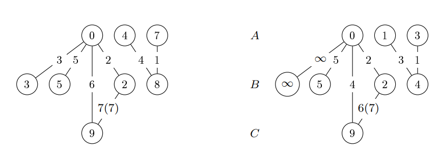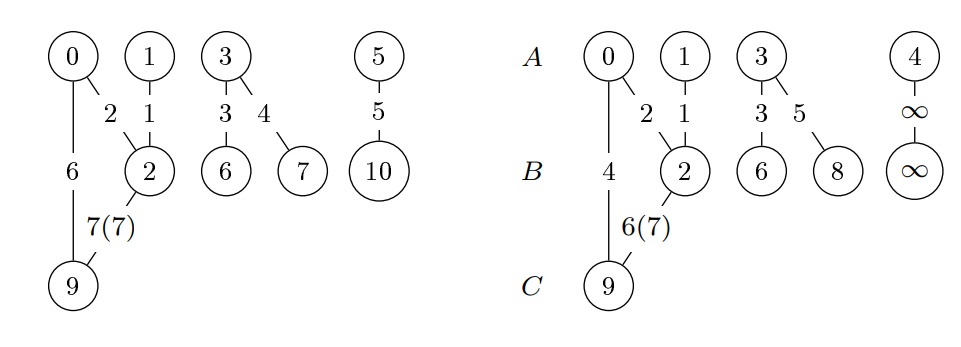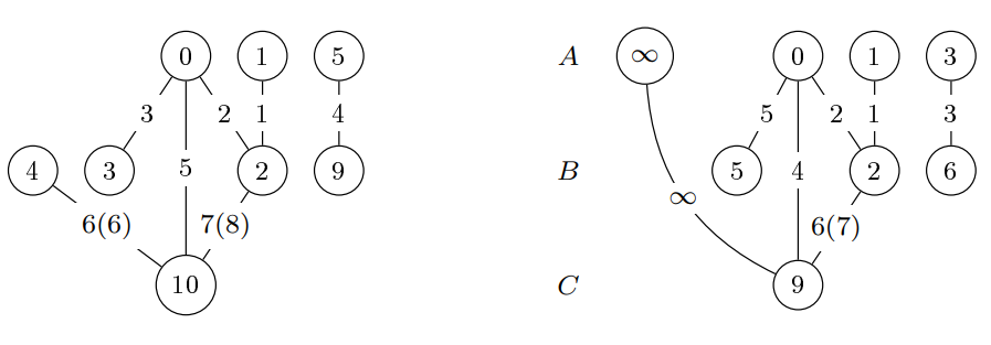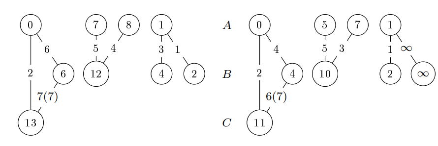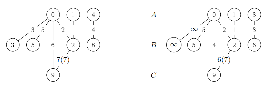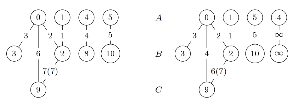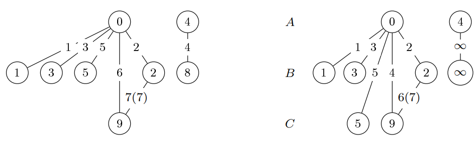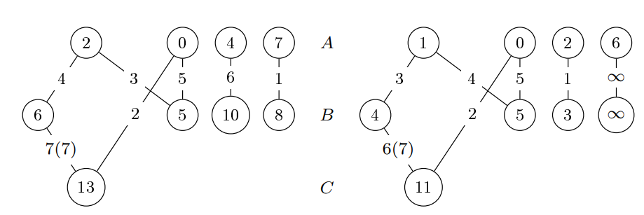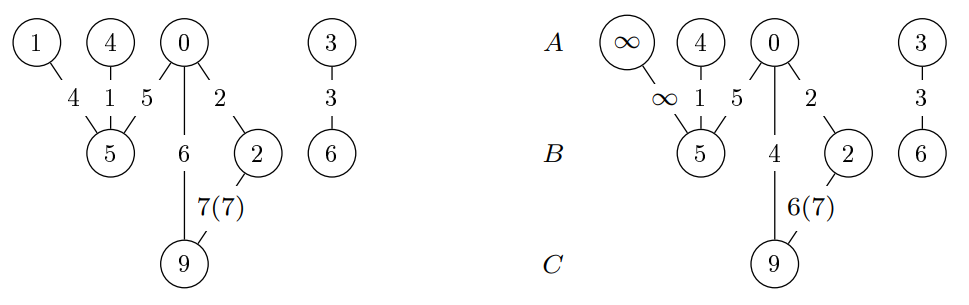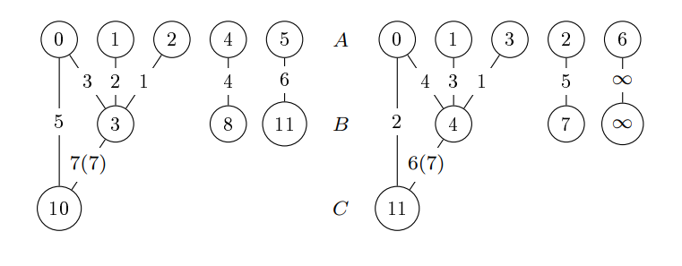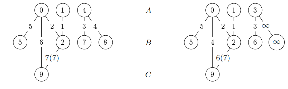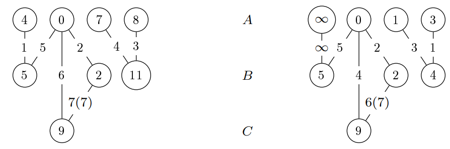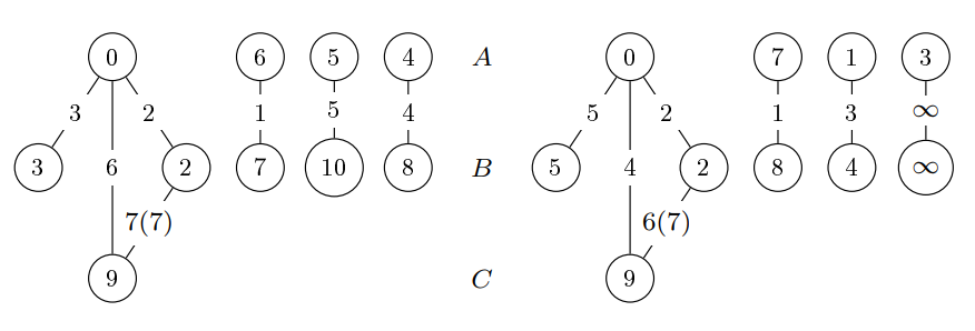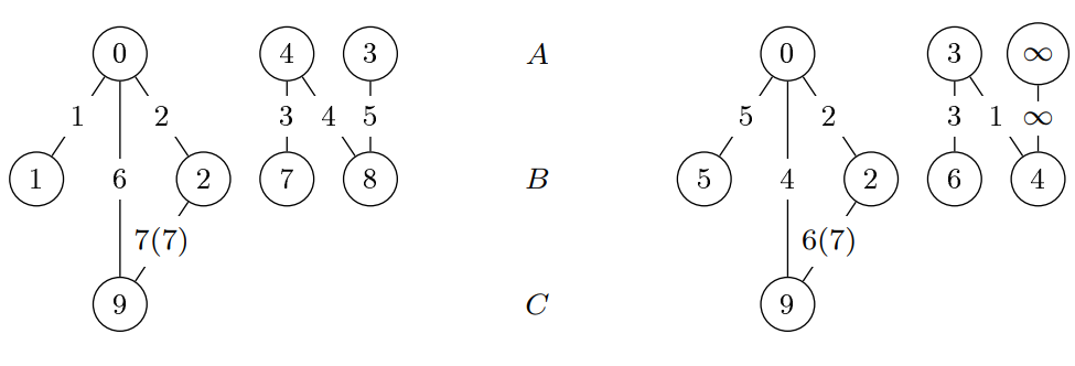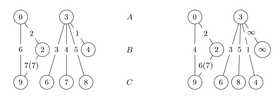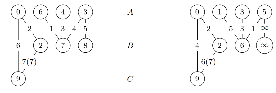 Definition 4.6. [6] Let \(G\) be a tripartite graph with \(n\) edges and vertex tripartition \(\{A,B,C\}\). A \(\rho\)-tripartite labeling of \(G\) is a \(\rho\)-labeling \(f\) that satisfies the following: