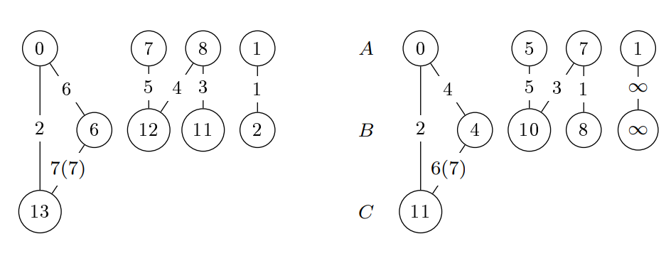 Definition 4.1. [12] Let \(G\) be a graph with \(n\) edges. A \(\rho\)-labeling of \(G\) is a one-to-one function \(f : V (G) \rightarrow \{0, 1,\dots, 2n\}\) inducing a function \(\ell : E(G) \rightarrow \{1, 2,\dots, n\}\) defined as \[\ell(uv) = \min\{|f(u)-f(v)|, 2n + 1 – |f(u)-f (v)|\},\] with the property that \(\{\ell(uv) : uv \in E(G)\} = \{1, 2,\dots , n\}\).