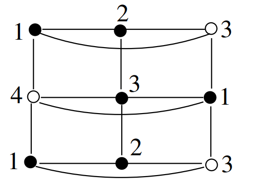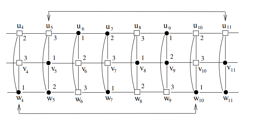 Furthermore, \(u_{11}, w_{11} \in S\) and \(v_{11} \notin S\). Observe that \[( _S(u_{10}), _S(v_{10}), _S(w_{10}))=( _S(u_{4}), _S(v_{4}), _S(w_{4})) = (1, 2, 3),\] \[(u_{10}, v_{10}, w_{10}) = (u_{4}, v_{4}, w_{4}) = (\bullet, \ \Box, \ \Box),\] \[(u_{11}, v_{11}, w_{11}) = (u_{5}, v_{5}, w_{5}) = (\bullet, \ \Box, \ \bullet).\]