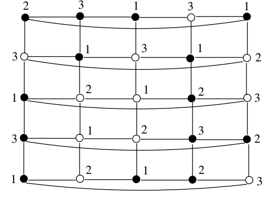 Problem 2.8. Let \(n\) and \(m\) be integers where \(n \ge 5\) is odd integer and \(m \ge 6\) and \(m \not\equiv 3 \pmod 4\). Which cylindrical graphs \(C_n \ \Box \ P_m\) possess a proper total dominating set?