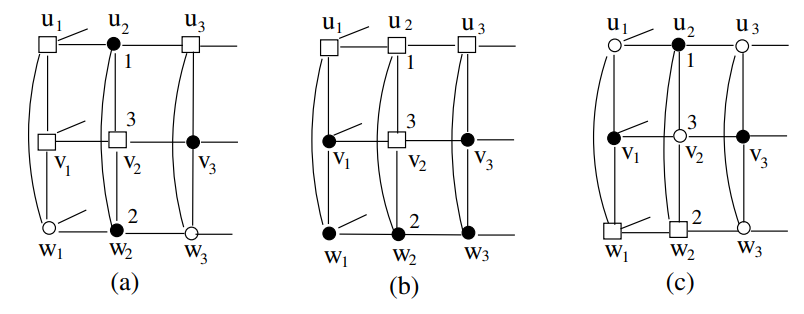 The proof of Lemma 2.3 is illustrated in Figure 3, where a vertex in \(S\) is denoted by \(\bullet\) and a vertex not in \(S\) is denoted by \(\Box\). In particular, \((w_4, v_4, u_4)=(\bullet, \Box, \Box)\) indicates that \(w_4 \in S\) and \(v_4, u_4 \notin S\). Thus, for \(i = 4\), we saw that \(( _S(w_4), _S(v_4), _S(u_4))=( _S(w_{10}), _S(v_{10}), _S(u_{10}))=(1, 3, 2)\), \(w_{10}, w_{11}, v_{11} \in S\) and \(v_{10}, u_{10}, u_{11} \notin S\). Thus, \((w_{4}, v_{4}, u_{4})= (w_{10}, v_{10}, u_{10})=(\bullet, \Box, \Box)\) and \((w_{5}, v_{5}, u_{5})= (w_{11}, v_{11}, u_{11})=(\bullet, \bullet, \Box)\).