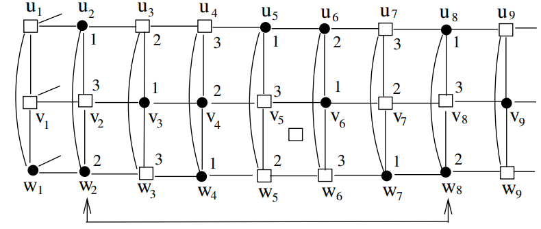 If \(m = 7\), then \( _S(u_1)= _S(u_7) = 2\), a contradiction. If \(m \ge 9\), then we have the situation in Figure 6. Observe that \[( _S(u_{8}), _S(v_{8}), _S(w_{8}))=( _S(u_{2}), _S(v_{2}), _S(w_{2})) = (1, 3, 2),\] \[(u_{8}, v_{8}, w_{8}) = (u_{2}, v_{2}, w_{2}) = (\bullet, \ \Box, \ \bullet),\] \[(u_{9}, v_{9}, w_{9}) = (u_{3}, v_{3}, w_{3}) = (\Box, \ \bullet, \ \Box).\]