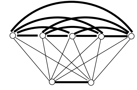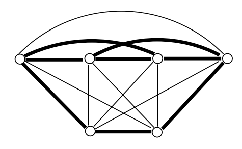 Perhaps the best known Ramsey number is \(R(K_3)\) which is \(6\). This result was established by Greenwood and Gleason [6] in 1955. In fact, this result essentially appeared as Problem A2 in the 1953 William Lowell Putnam Exam (see [6]). While every red-blue coloring of \(K_6\) always results in a monochromatic triangle \(K_3\), it turns out that every red-blue coloring of \(K_6\) always results in at least two monochromatic triangles (see [5]). However, it is not true that every red-blue coloring of \(K_6\) always results in two edge-disjoint monochromatic triangles. For example, in the red-blue coloring of \(K_6\) in Figure 1 (where a bold edge represents a red edge and a thin edge represents a blue edge), there do not exist two edge-disjoint monochromatic triangles.