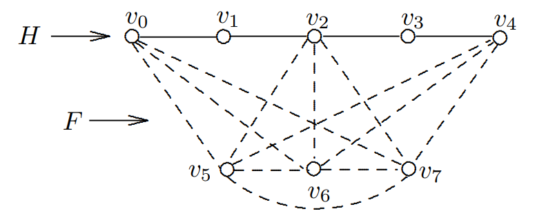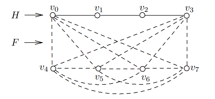 If \(H\) is a Hamiltonian subgraph of \(G\), then no vertex of \(H\) is adjacent to any vertex in {\(v_4\), \(v_5\), \(v_6\), \(v_7\)}, for otherwise \(G\) contains a path of length 4 or more. Therefore, if \(H\) is Hamiltonian, then \(|E(G)|=|E(H)| \le 6\), a contradiction. Thus, we may assume that \(H\) is not Hamiltonian. Thus, \(v_0v_3 \notin E(H)\) and at most one of \(v_0v_2\) and \(v_1v_3\) is an edge of \(H\). Therefore, \(|E(H)|\le 4\). If both \(v_1\) and \(v_2\) are adjacent to a vertex \(v_i\) where \(4 \le i \le 7\), then \(G\) contains a path of length 4, a contradiction. Thus, \(|E(F)| \le 4\) and so \(|E(G)|=|E(H)|+ |E(F)|\le 4+4= 8\), a contradiction.
