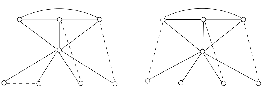 Case 2. \(H_r = (K_3+\overline{K_4}) \vee K_1\). Then \(\overline{H}_r=(K_4\vee \overline{K}_3)+ K_1\). If all subgraphs \(F_1, F_2, F_3\) are blue, then \(G_r = H_r\) and \(G_b=\overline{H}_r=(K_4\vee \overline{K}_3)+ K_1\). Since the subgraph \(K_4\vee \overline{K}_3\) of \(G_b\) contains four pairwise edge-disjoint copies \(F_1', F_2', F_3', F_4'\) of \(3K_2\), it follows that \(F_1', F_2', F_3', F_4'\) are four pairwise edge-disjoint blue copies of \(3K_2\) in \(G_b\) (and in \(G\)). Thus, we may assume that at least one of \(F_1, F_2, F_3\) is red, say \(F_1\) is red. Let \(J_r = G[E(H_r)\cup E(F_1)]\). Then \(J_r\subseteq G_r\) is a red subgraph of \(G\) and \(E(J_r) \cap [E(F_2)\cup E(F_3)]=\emptyset\). Furthermore, \(J_r\) is isomorphic to one of the two graphs in Figure 5 where the three dashed edges belong to \(F_1\) in each graph. In either case, \(J_r\) contains three pairwise edge-disjoint copies \(F_1^*, F_2^*, F_3^*\) of \(3K_2\) that are edge-disjoint from \(F_2\) and \(F_3\). Thus, \(G\) contains four pairwise edge-disjoint monochromatic copies of \(3K_2\). For example, \(F_1^*, F_2^*, F_2, F_3\) are four pairwise edge-disjoint monochromatic copies of \(3K_2\) in \(G\).
