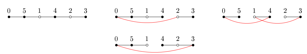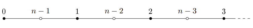 In [6], Rosa proved that all caterpillars are \(\alpha\text{-graphs}\). When the caterpillar is a path, the labeling \(f\) given by Rosa follows the pattern shown in Figure 1.