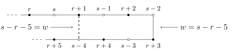 Suppose now that \(x\) is odd. If Eq. (1) holds, then \[\begin{aligned} f(v_{i-x})-f(v_{i+1+x})&=f(v_{i+1})-\frac{x+1}{2}-\Big(f(v_{i})-\frac{x+1}{2}\Big)\\ &=f(v_{i+1})-f(v_{i})=w. \end{aligned}\]