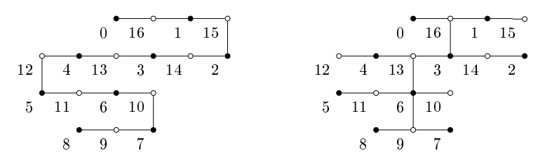 Certainly, we can choose \(n_1+n_2+ \cdots + n_k=n,\) where \(n_i \geq 2,\) and position the vertices of each subpath \(P_{n_i}\) on the line \(y=k-i\) in such a way that when all the vertices are in place, the path \(P_n\) forms a \(90^{\circ}\) angle zig-zag. Thus, each path-like tree \(T\) is associated with a \(k\text{-part}\) partition of \(n,\) that induces the subpaths \(P_{n_i}.\) Suppose that \(T\) is any path-like tree obtained from \(P_n;\) let \(v_1, v_2, \dots, v_n\) be the consecutive vertices of \(P_n,\) we say that \(v_j\) is a bending point of both \(P_n\) and \(T\) if \(j\) is either \(\tilde{n}_i\) or \(\tilde{n}_i+1,\) where \(\tilde{n}_i=\sum_{j=1}^in_j.\) Note that the number of bending points on \(T\) is always even, in particular, if \(n_1+n_2+ \cdots + n_k=n,\) \(T\) has exactly \(2(k-1)\) of these points; the bending points \(v_i\) and \(v_{i+1}\) form a tandem if \(v_i\) lies on \(y=k-i\) and \(v_{i+1}\) lies on \(y=k-i-1.\) These vertices, together with \(v_1\) and \(v_n,\) play an important role in our main theorem. In Figure 4 we show an example of an embedding on the integral grid of the path \(P_{17},\) where \(n_1=4, n_2=6, n_3=4\) and \(n_4=3,\) together with a path-like tree, \(T,\) obtained from the embedding. The bending points are the vertices labeled 15, 2, 12, 5, 10, and 7. The number of non-isomorphic path-like trees that can be obtained from a given embedding of the path on the integral grid is substantial, for the embedding shown in this figure, there are 48 non-isomorphic path-like trees, including the path itself.